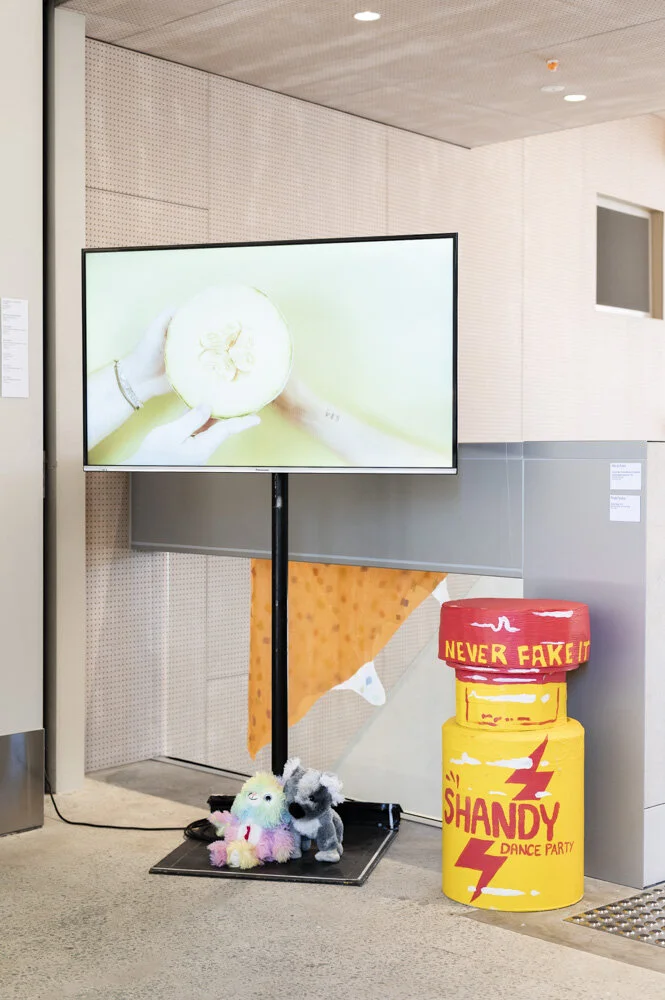 Also exhibited on the night are props and sculptures by Mark du Potiers, Phoebe Sheehy, Blair Foley and video work produced and/or directed by Benjamin Cotgrove, Dan Anderson, Mary Duong, and Blake Howson.