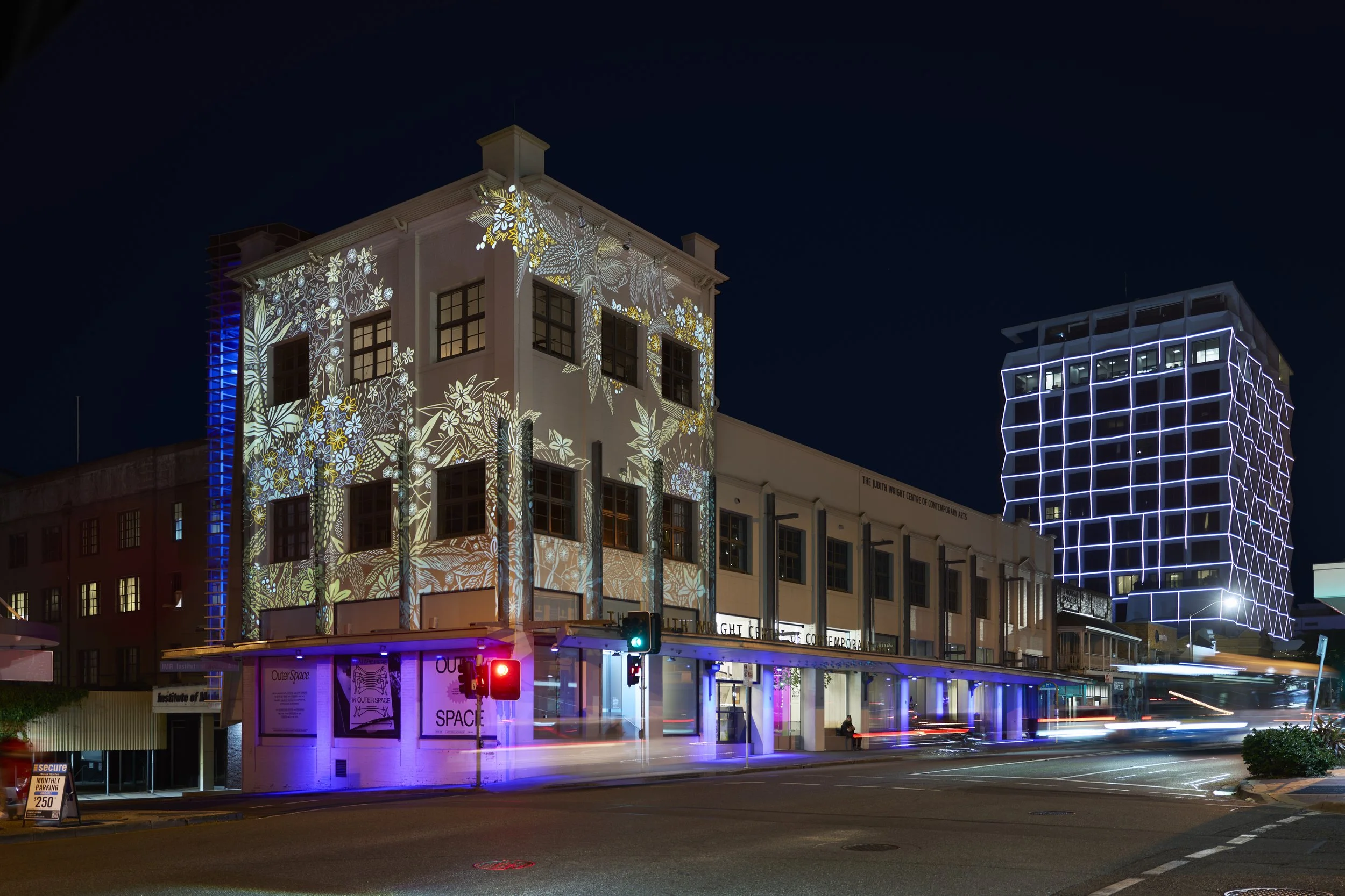 April 3 – 30, 2026Tamika’s projected artwork, “Complex Ecologies: Evergreens at Dusk” depicts native evergreens that continuously thrive in streets of Brisbane, heroing the Golden Penda, Australian Lemon Myrtle, Native Frangipani and Brisbane’s floral emblem, the Golden Wattle. Looking up at these trees as dusk fell, Tamika noticed the intricate details of these plants being illuminated by the light. These details were not static but moved with the rhythm of their surrounding landscape. The design for this work was realised through the creation of a linocut print on paper, where Tamika used linocut carving as a tool to capture her visceral impression of place. The relationship she has with this carving process corresponds to the strength and fluidity of her natural environment, the constant randomness that arises from the directions in which she carves allows newly discovered forms to grow. By translating the minute details of flora onto Outerspace’s Projection Façade, the small details seen in these plants will be amplified and brought to the foreground, influencing how we engage with the work; what is discovered, what is noticed.